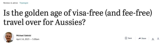 这意味着“免签”的便利性正在打折扣,逐渐影响到澳洲人常去的旅行目的地。