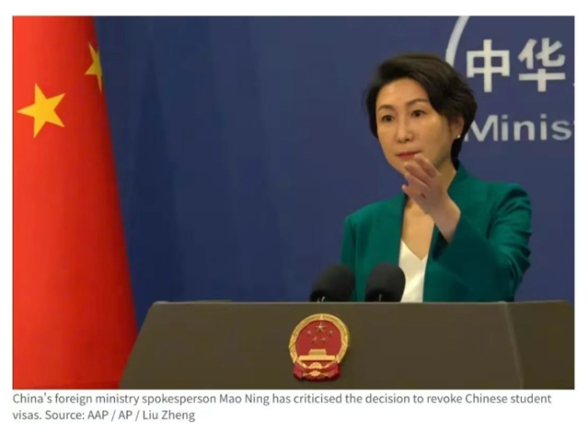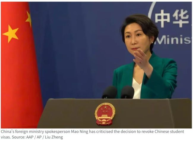 毛宁表示:“美方以意识形态和国家安全为借口,无理取消中国留学生签证,严重损害中国留学生的合法权益,干涉两国正常人文交流。中方对此坚决反对,已向美方提出交涉。”