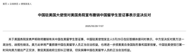 中国驻美国大使馆也对美国国务院宣布撤销中国留学生签证事表示了坚决反对!