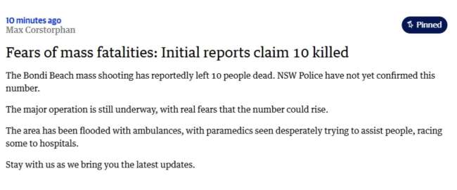 悉尼邦迪海滩发生大规模枪击事件,至少16人死亡,伤者已被送往悉尼各地的医院。